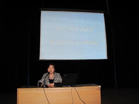 讲座上,明庆华教授细致、全面地从凸现教学思想、体现教学思路、显现教学关键要素设计、活现方法规律的总结、呈现教学的艺术性、展现教学与多媒体的整合、表现教学评价与反思意识等方面向青年教师们介绍了关于教学设计的基本要求,并对教学媒体设计进行了重点讲解。陈贻汉教授结合自己从教多年的心得体会,分别从理念、态度、方法三方面向青年教师讲解如何搞好课堂教学。他强调,扎实的业务基础、较高的学术水平、强烈的敬业精神、恰当的教学方法是搞好课堂教学工作的根本保证,要做到“心中有书,目中有人,手中有法,口中有辞”。