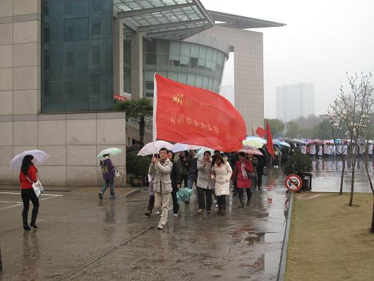 由各单位组成的23个方阵,迎着丝丝春雨,井然有序地从图书馆前广场出发,精神抖擞、健步行走在美丽的校园,途径国际教育学院、物电学院、人文大楼、嘉会园、家属区,抵达终点图书馆前广场。不少单位极富创意的横幅和口号,充分展示了湖大教职工共创美好生活、构建美好校园的喜悦情怀,推进了和谐校园建设。