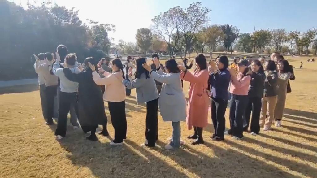 活动伊始,教职工们在博物馆前大草坪上,开启了趣味十足的户外团建环节,各小组成员默契配合、奋勇争先,草坪上不时响起阵阵欢笑,平日里在讲台前严谨授课的老师们,此刻卸下了工作的疲惫,尽情投入到游戏之中。